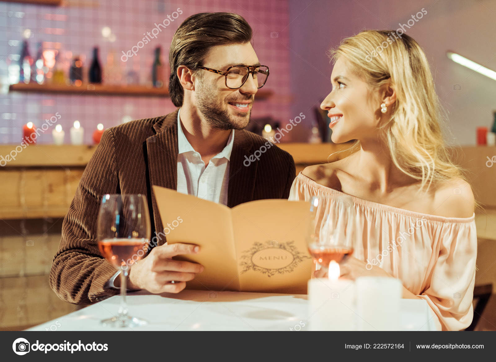レストランでロマンチックな夕食時にお互いを見てメニューと笑顔のカップル — 無料画像 - ストック画像